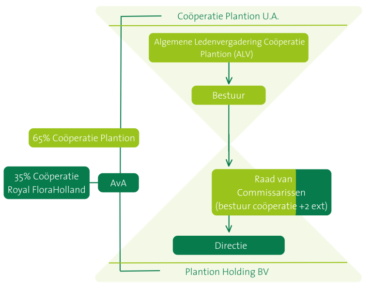 Coöperatie Plantion (65%) en Royal FloraHolland (35%) zijn samen de aandeelhouders van Plantion Holding BV, en vormen zo de Algemene Vergadering van Aandeelhouders (AvA). Het door de leden benoemde bestuur van de coöperatie vertegenwoordigt Coöperatie Plantion bij de AvA.